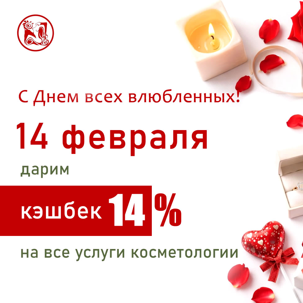 В честь праздника 14 февраля мы дарим Вам кэшбек 14% на ВСЕ услуги косметологии!